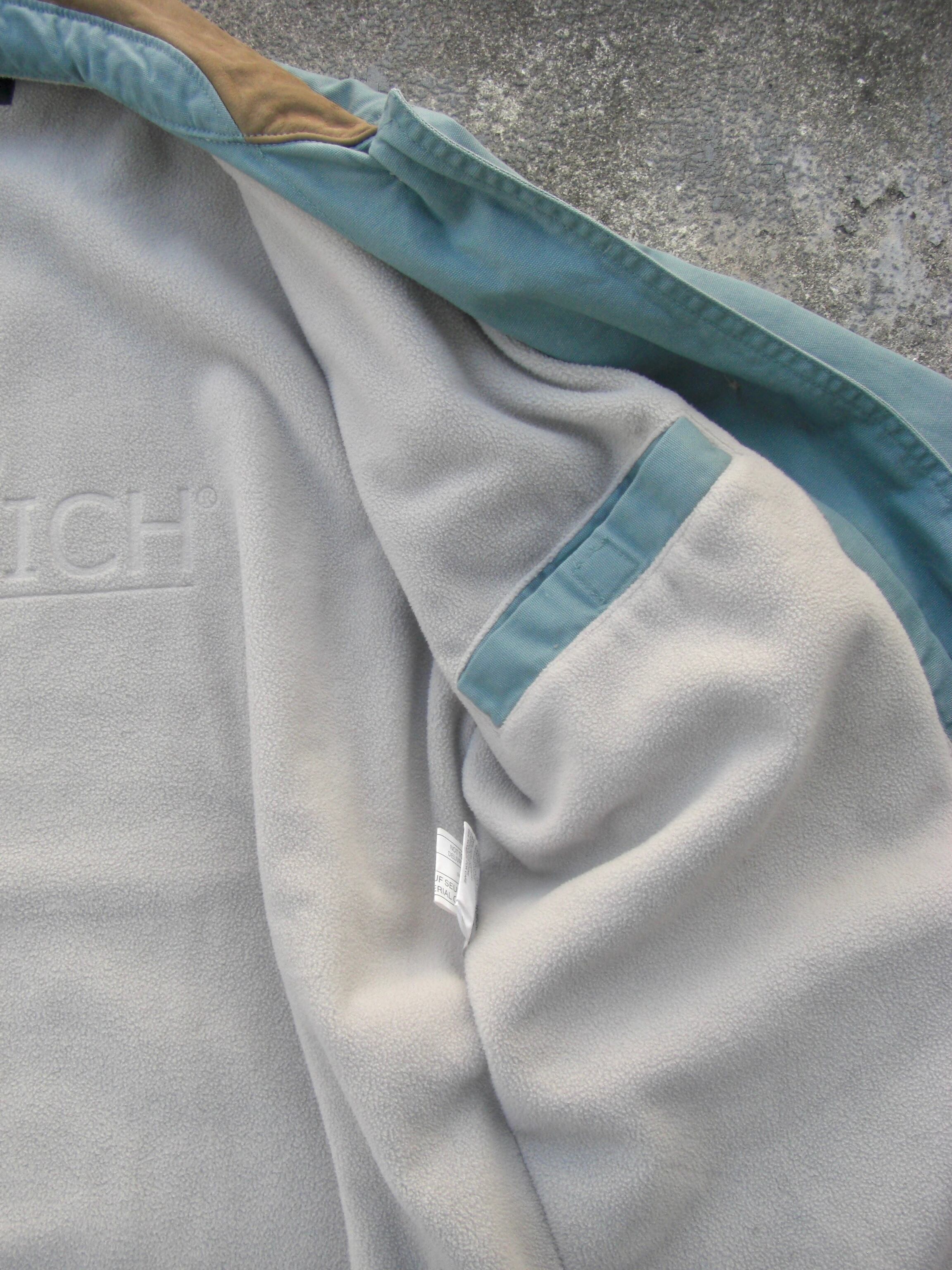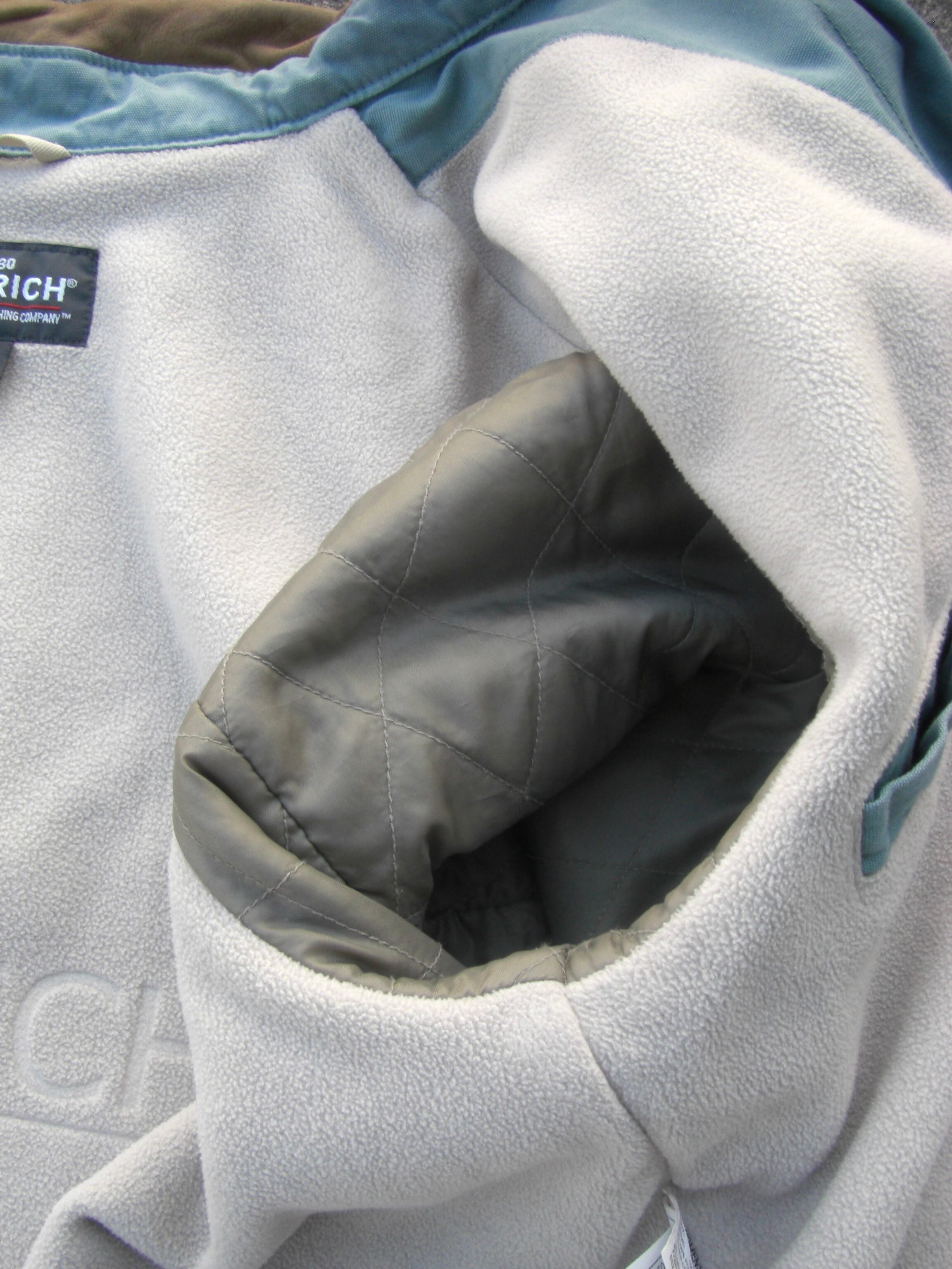 裏地はフリース素材で、袖からキルティングの裏地に切り替わります(写真参照)